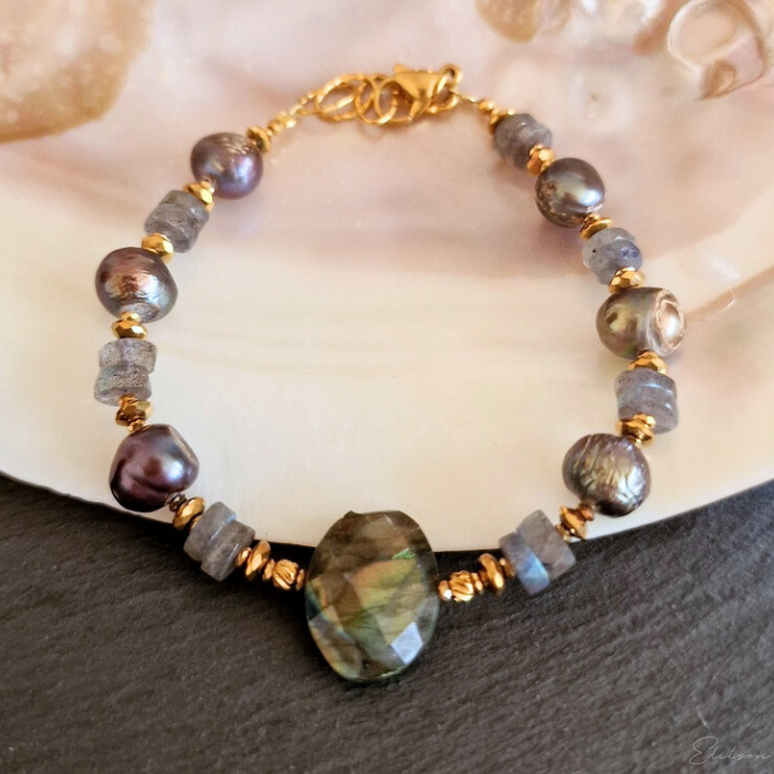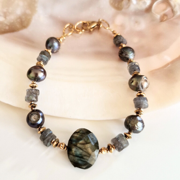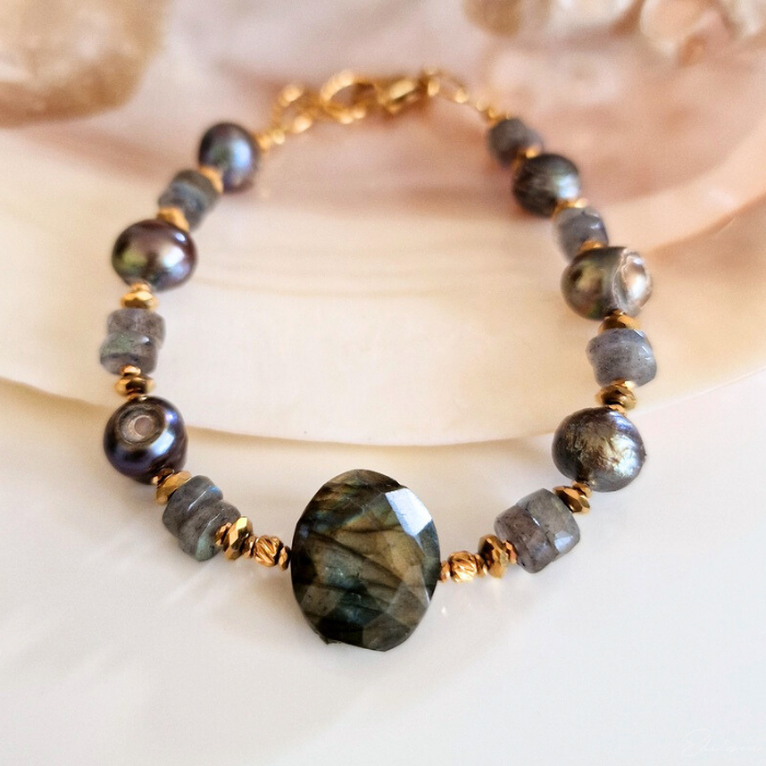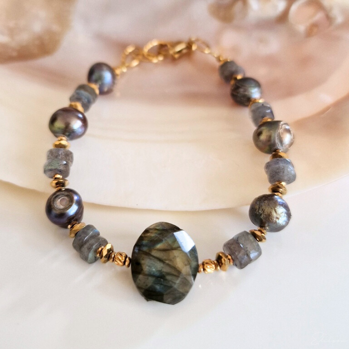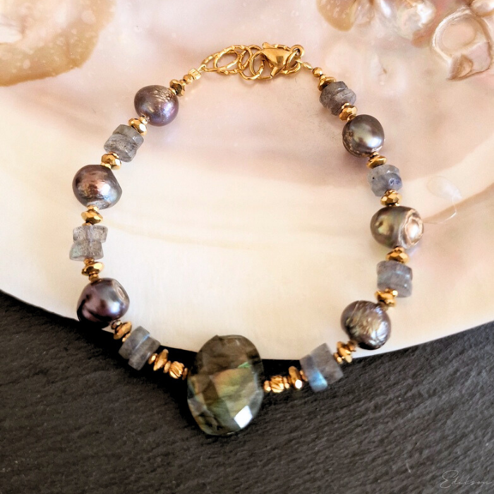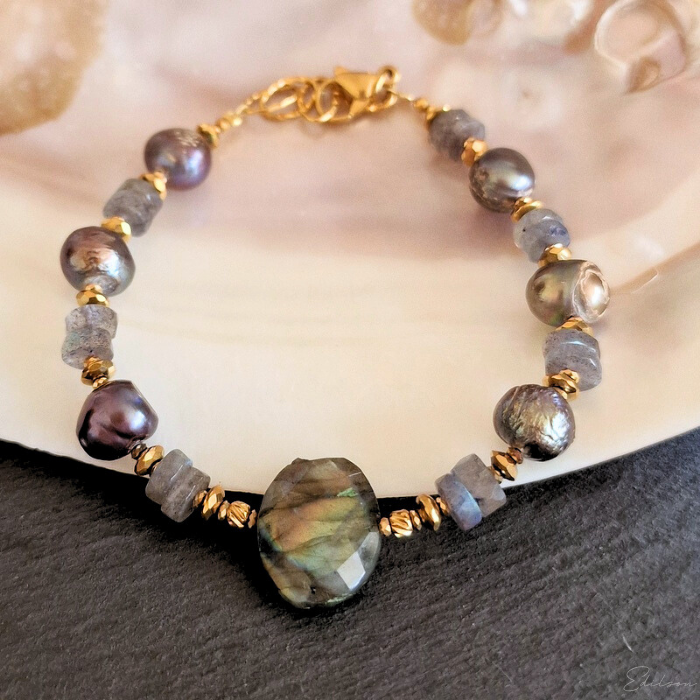 Ręcznie wykonana bransoletka z kamieni naturalnych - labradorytów oraz pereł w różnych wybarwieniach i kształtach, nieco niedoskonałych ale przez to wyjątkowych.