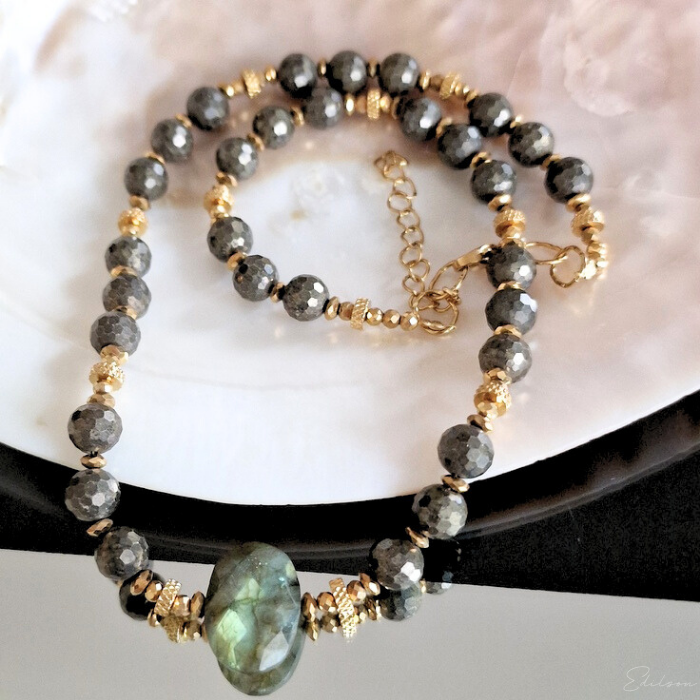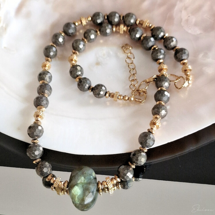 W środkowej części naszyjnika pięknie mieniący się labradoryt.