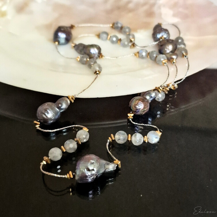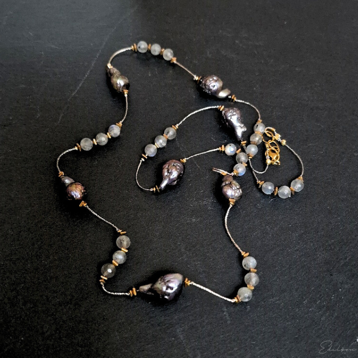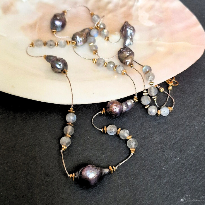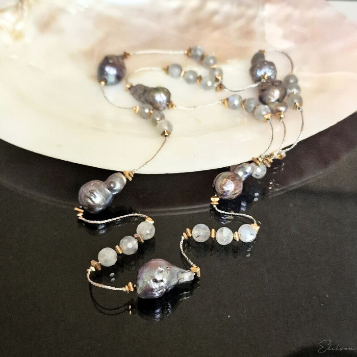 Ręcznie wykonany długi naszyjnik z szarych pereł barokowych oraz kamieni naturalnych - labradorytów.