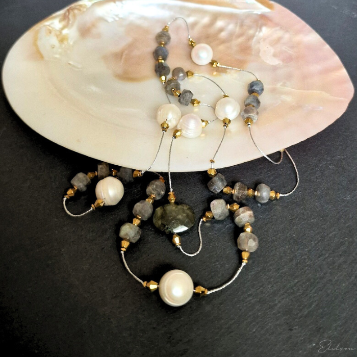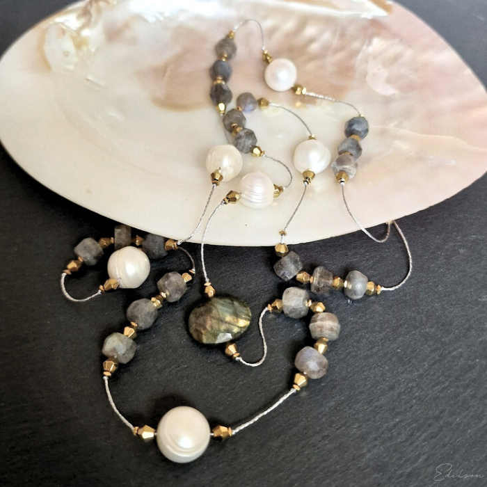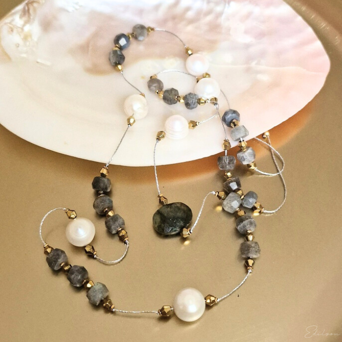 Ręcznie wykonany długi naszyjnik z dużych białych pereł oraz kamieni naturalnych - labradorytów.