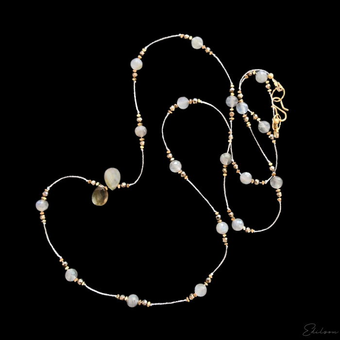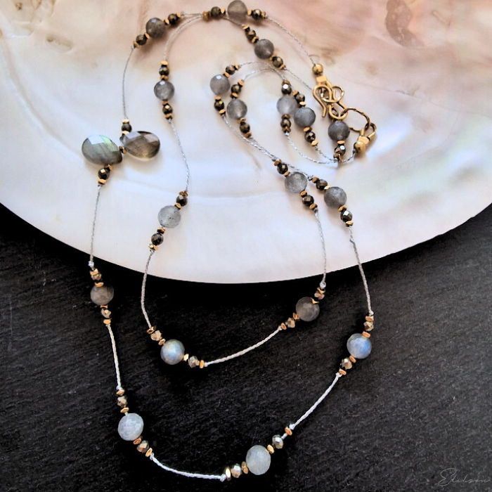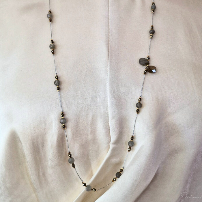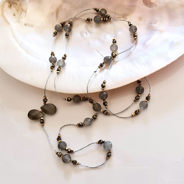 Ręcznie wykonany długi naszyjnik z kamieni naturalnych - labradorytów.
