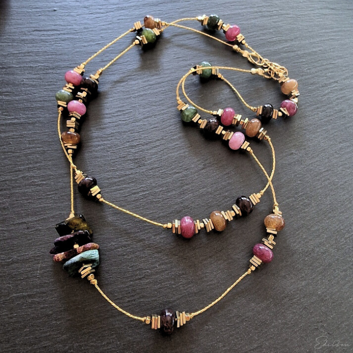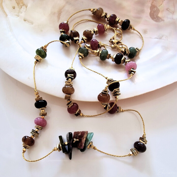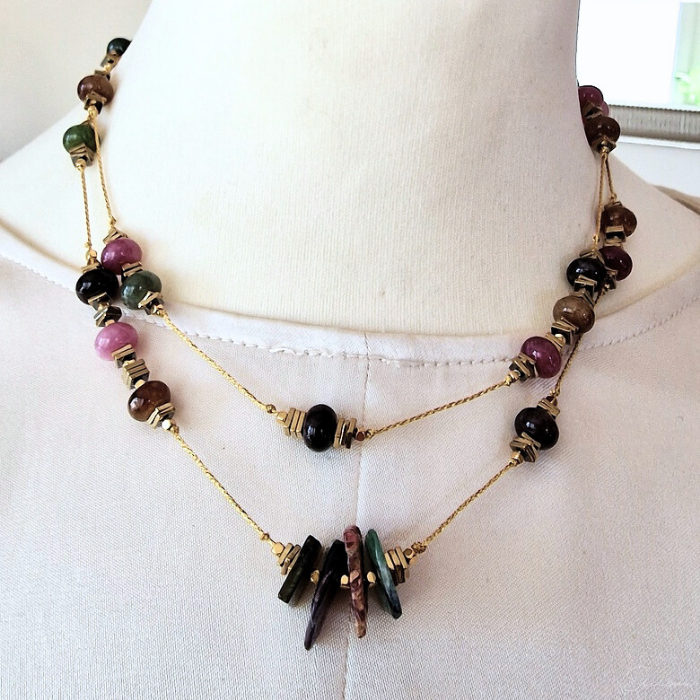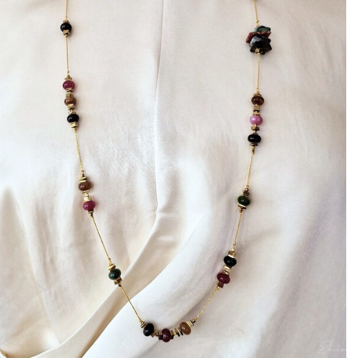 Ręcznie wykonany długi naszyjnik z kamieni naturalnych - turmalinów.