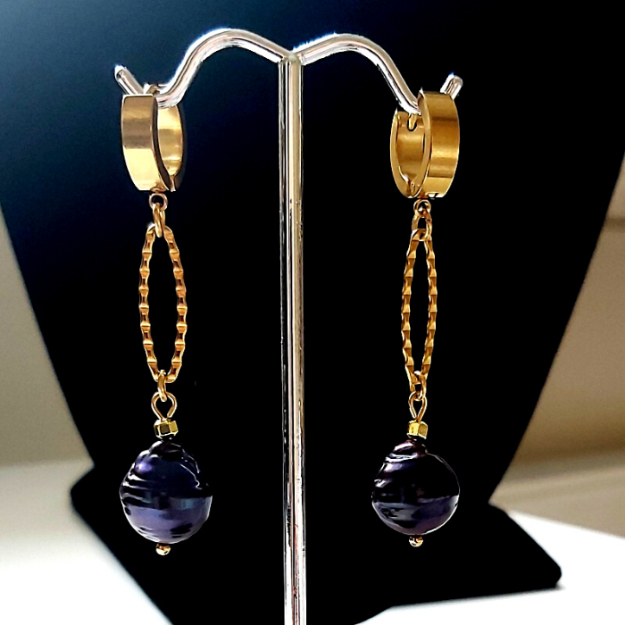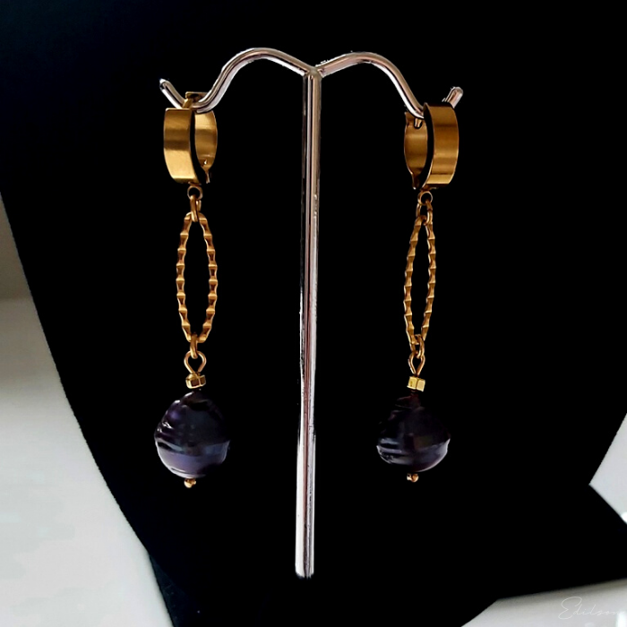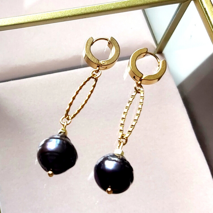 Wprowadź do swojej kolekcji nutę tajemniczości i elegancji dzięki naszym ręcznie wykonanym kolczykom z czarnymi perłami o pięknym overtonie. Te unikatowe klejnoty natury zostały starannie osadzone w złotej połyskującej stalowej oprawie, tworząc wyrazisty kontrast i emanując subtelnym blaskiem.