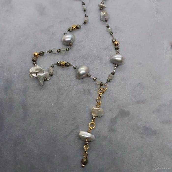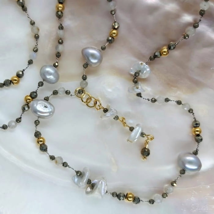 Ręcznie wykonany długi naszyjnik z szarych nieregularnych pereł keshi, pereł owalnych oraz kamieni naturalnych - labradorytów.