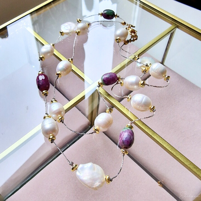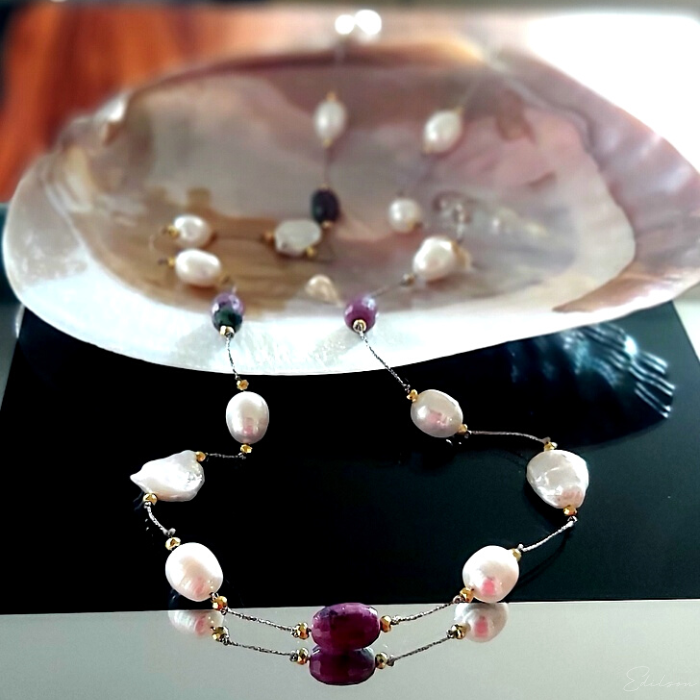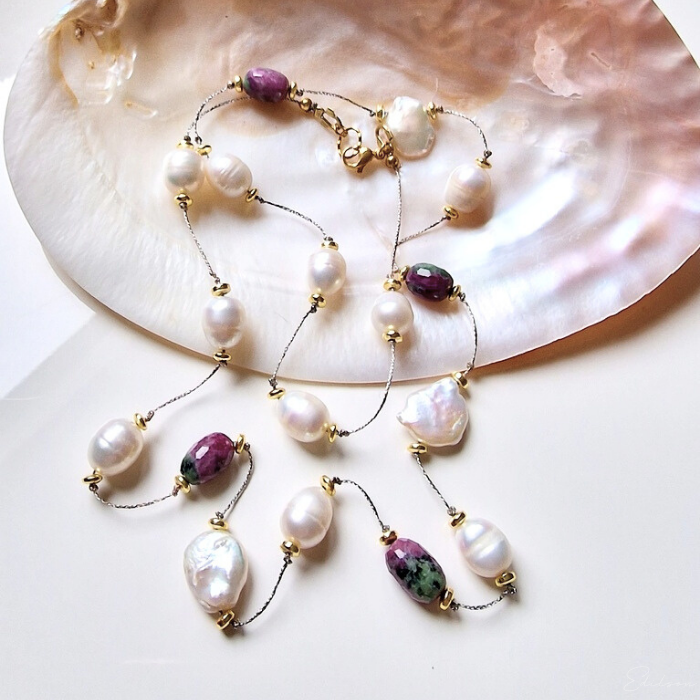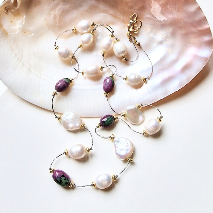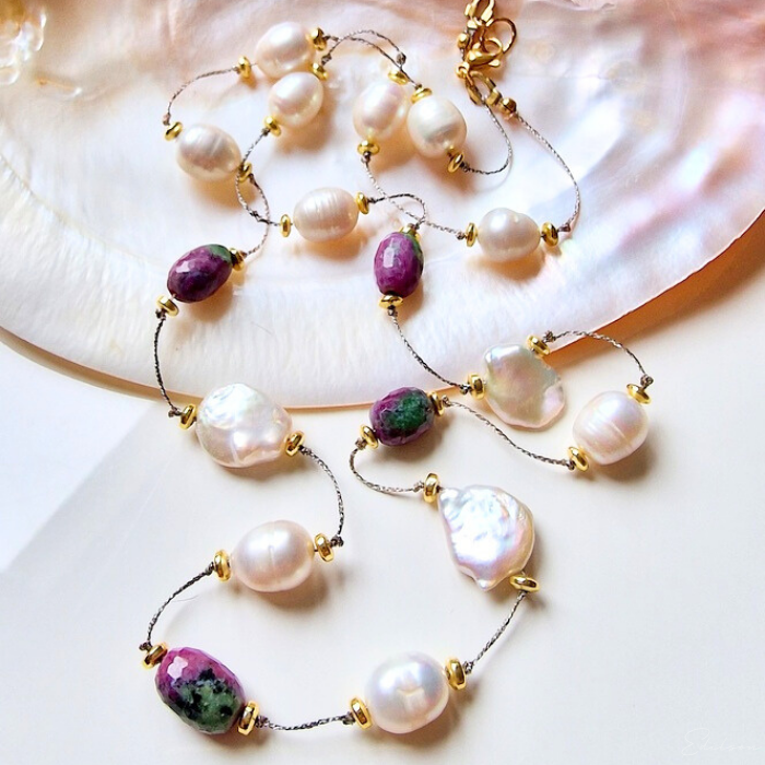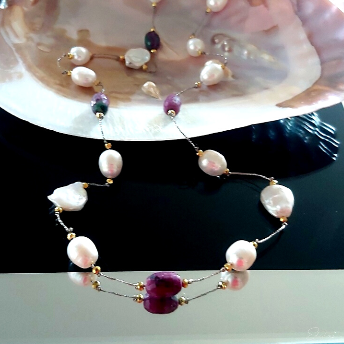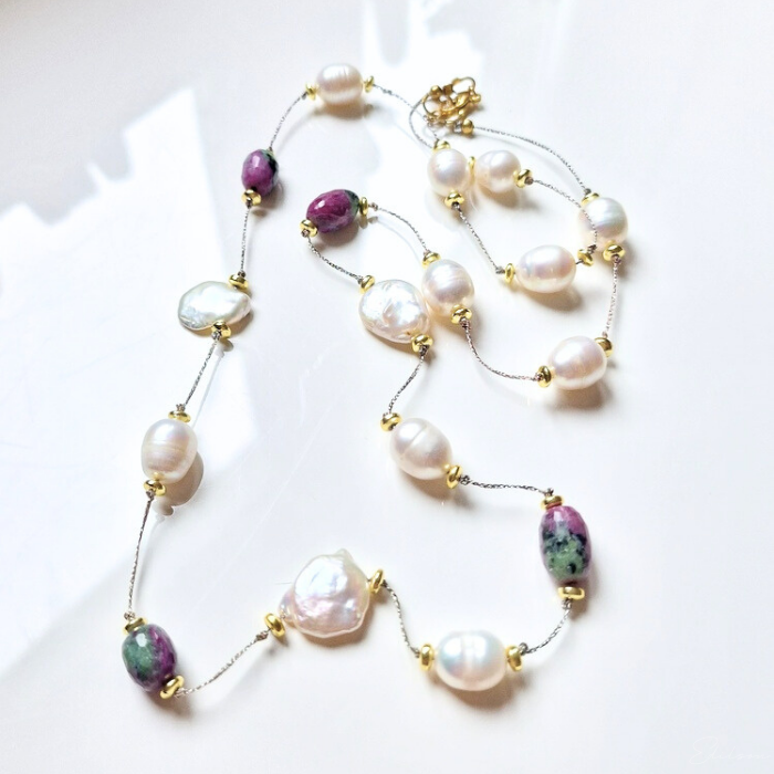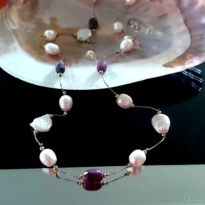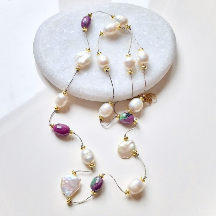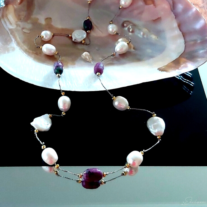 Ręcznie wykonany naszyjnik z dużych nieregularnych pereł hodowlanych oraz kamieni naturalnych - rubinów i zoizytów.