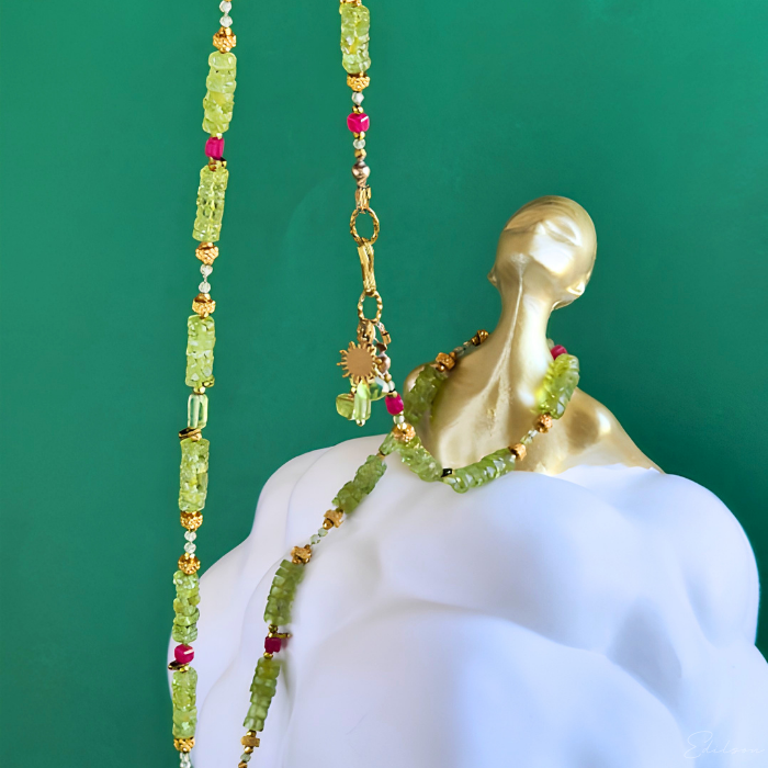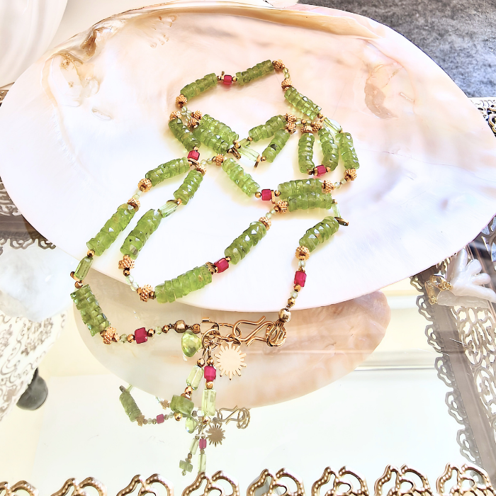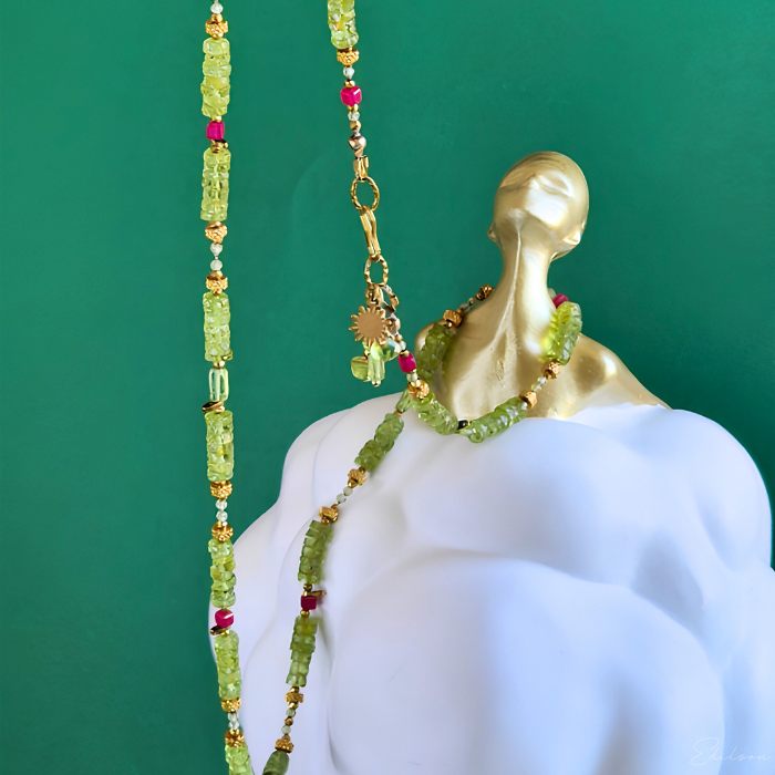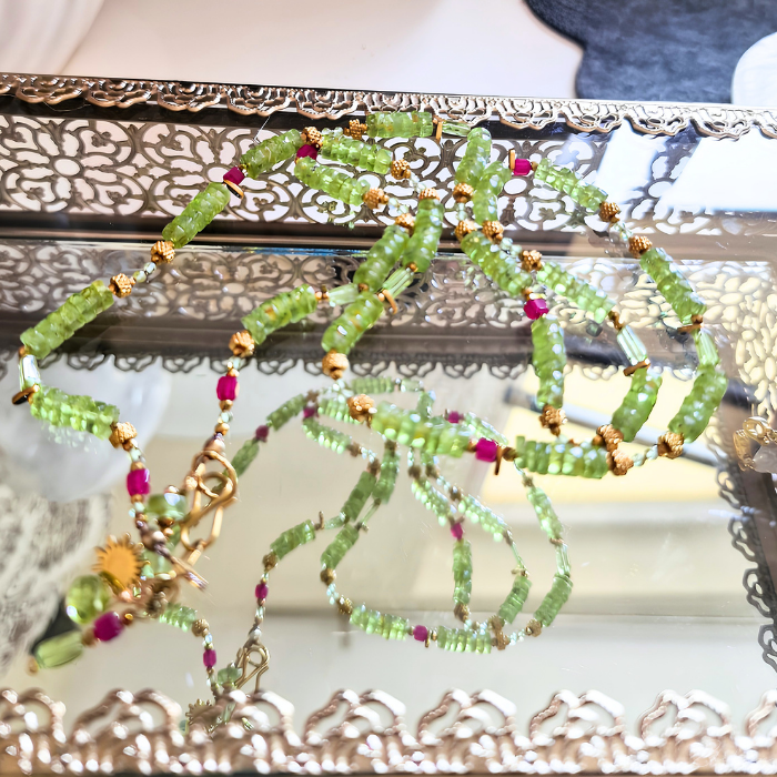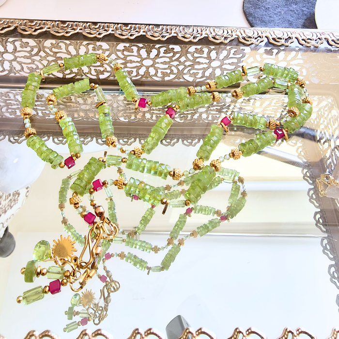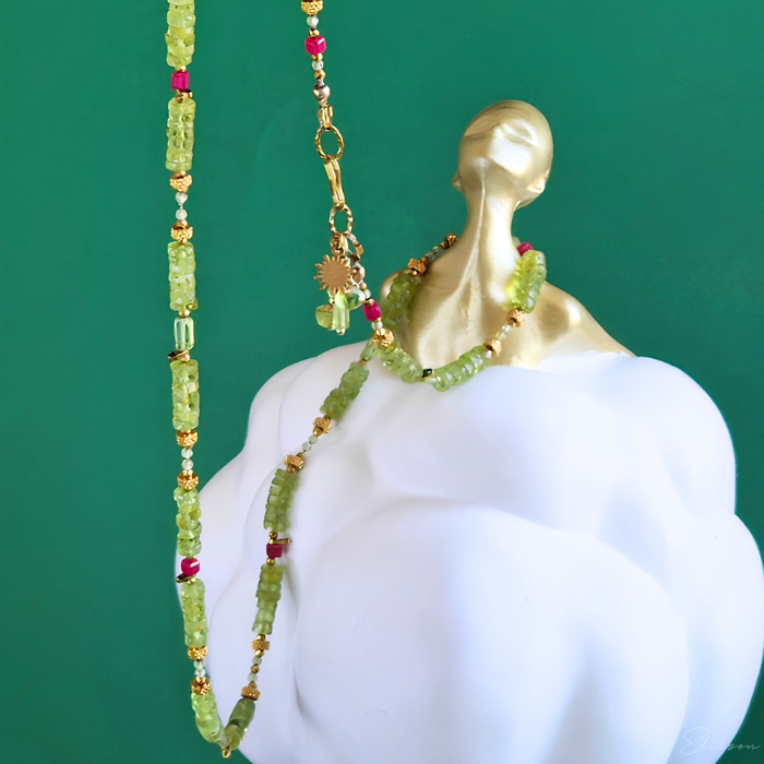 Ręcznie wykonany długi naszyjnik z oliwinami i rubinkami. Oliwiny to ręcznie szlifowane nieregularne talarki. Rubiny mają postać kosteczek.