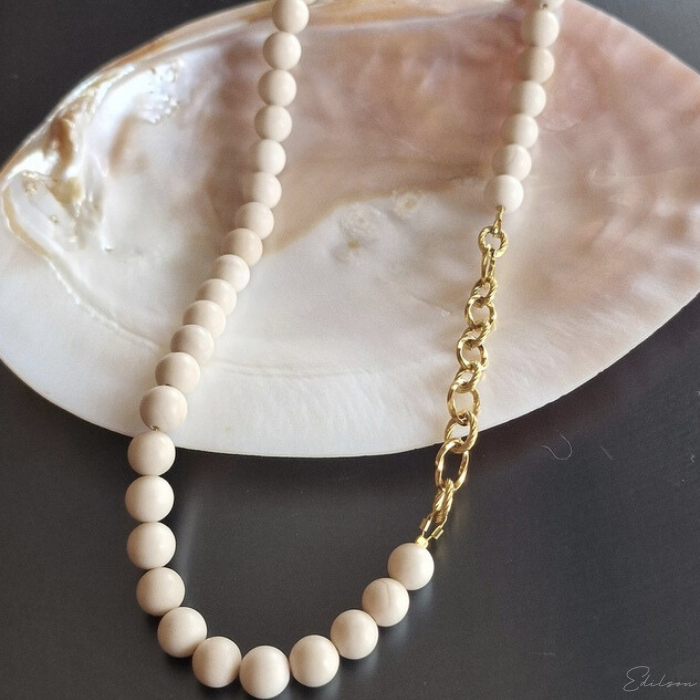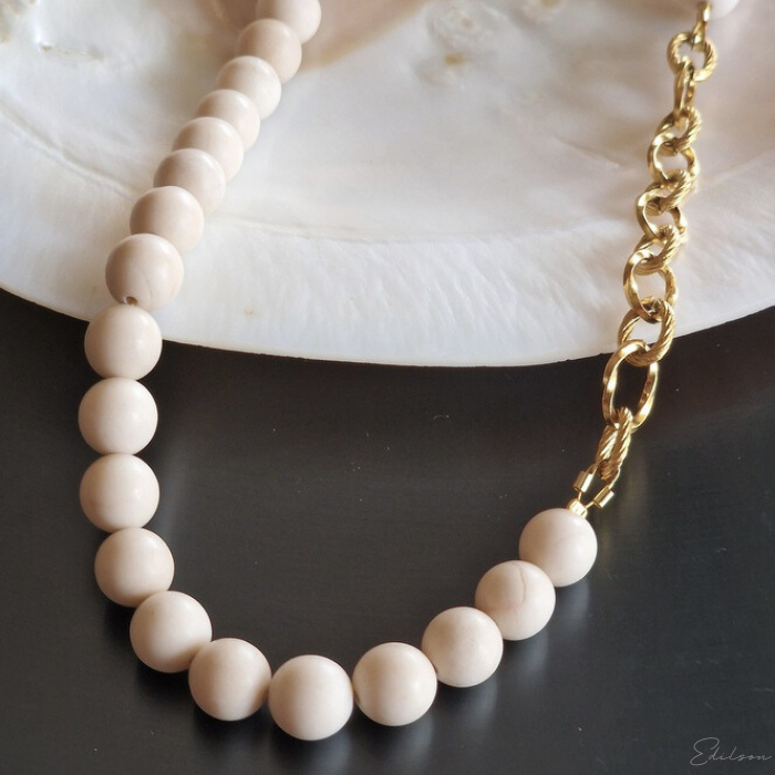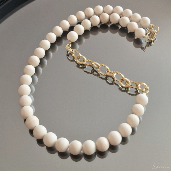 Wykonany ręcznie krótki naszyjnik z kamieni rzecznych w odcieniu subtelnego beżu, przywołującego na myśl ciepły, delikatny nadmorski piasek.