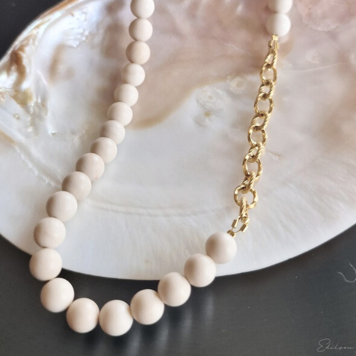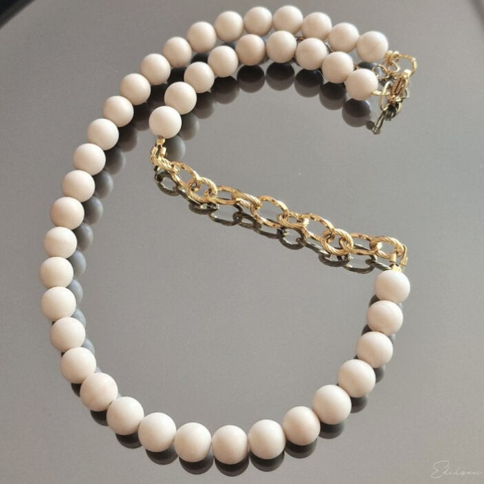 Wykonany został z matowych kamieni rzecznych o cudownie aksamitnej fakturze – delikatnych i gładkich w dotyku. Koraliki w różnych rozmiarach pięknie układają się wokół szyi, tworząc wrażenie lekkości i harmonii.
