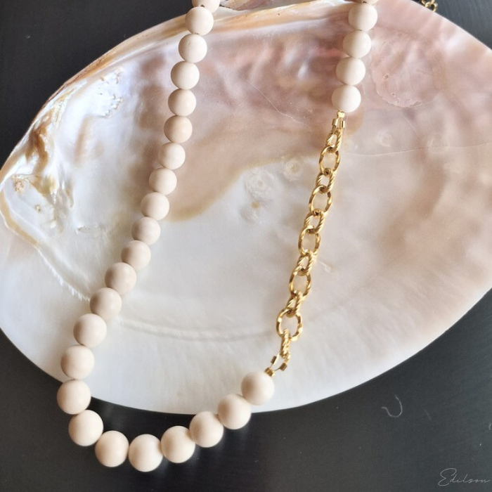 Naszyjniki z kamieni rzecznych można dowolnie łączyć tworząc eleganckie kompozycje, które będą idealnym uzupełnieniem letnich stylizacji – od lnianych sukienek po klasyczne białe koszule.