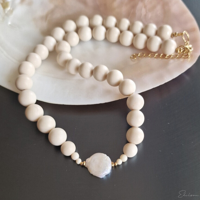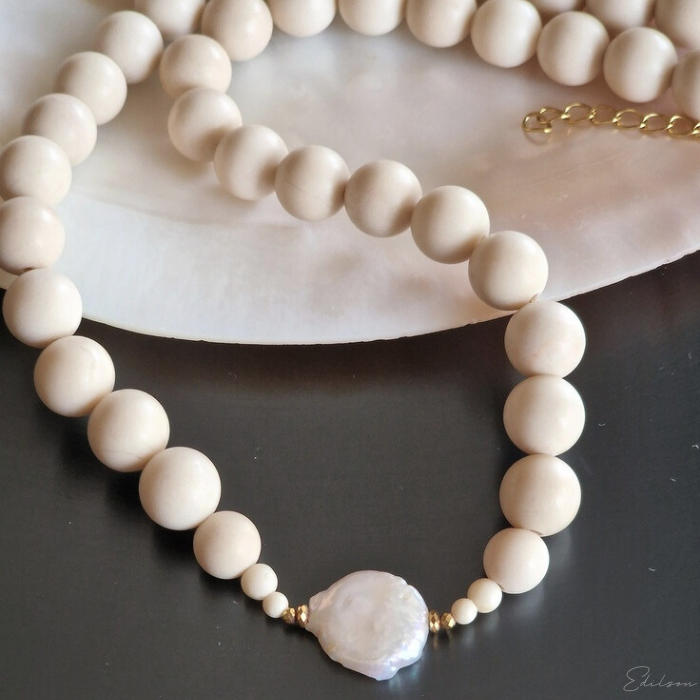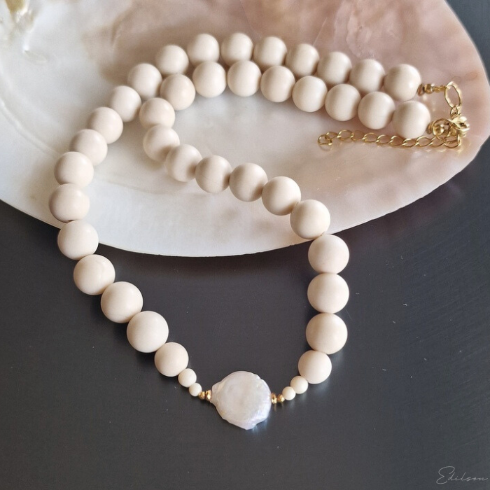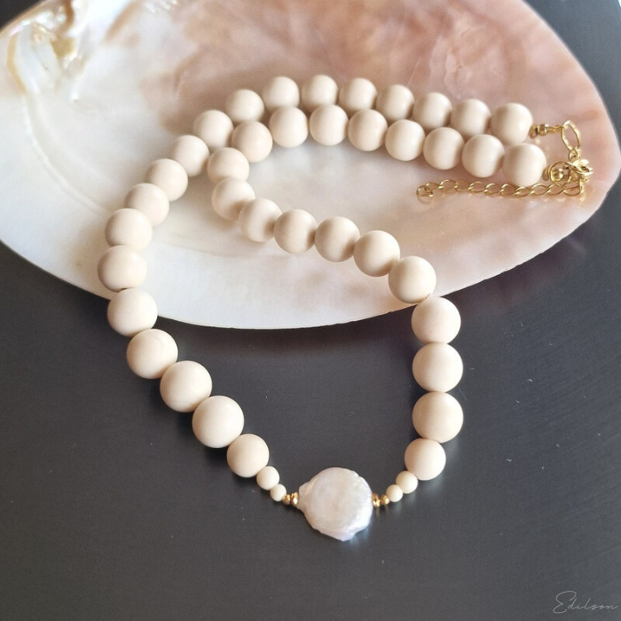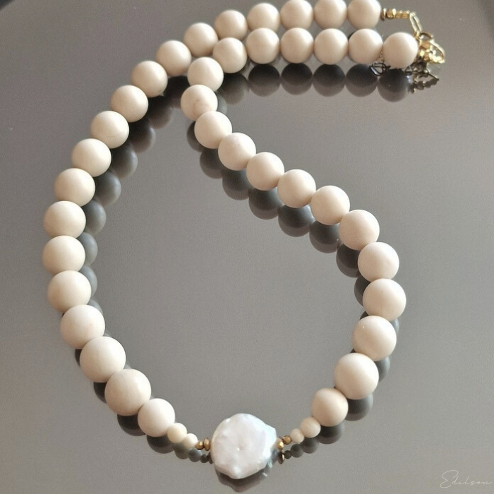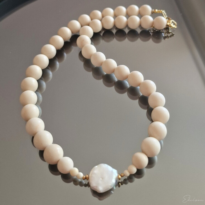 Wykonany został z matowych kamieni rzecznych o cudownie aksamitnej fakturze – delikatnych i gładkich w dotyku. Koraliki w różnych rozmiarach pięknie układają się wokół szyi, tworząc wrażenie lekkości i harmonii.