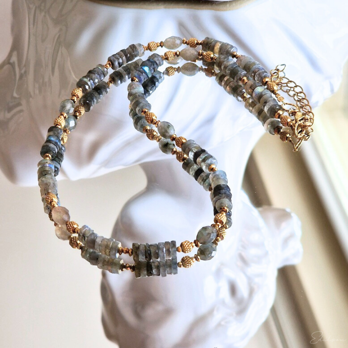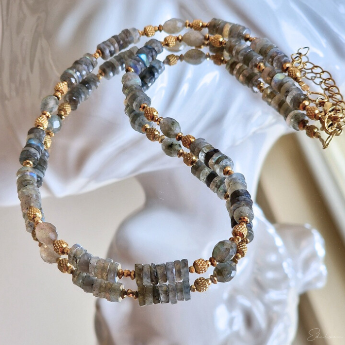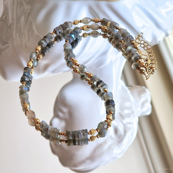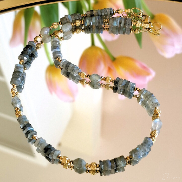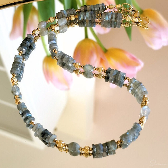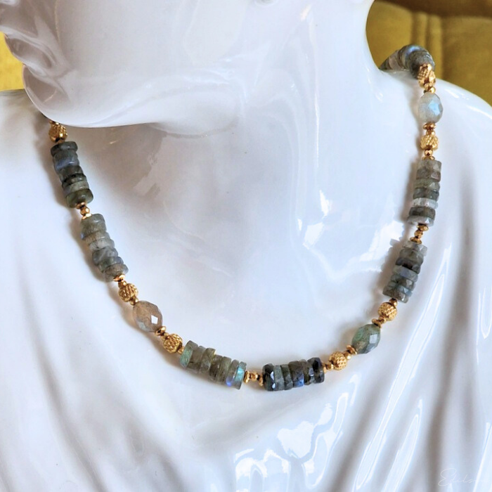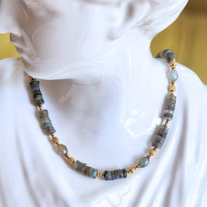 Ręcznie wykonany krótki naszyjnik z kamieni naturalnych - labradorytów. Kamienie mają postać nieregularnych talarków pięknie wielobarwnie labradoryzujących oraz fasetowanych oliwek.